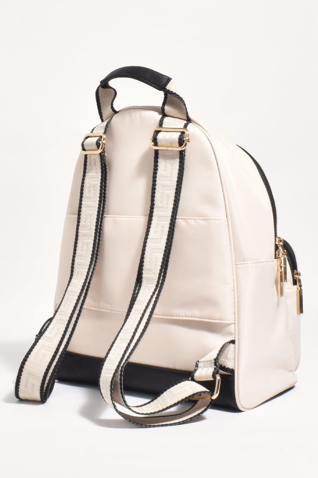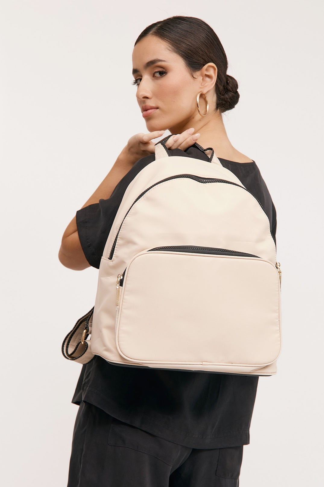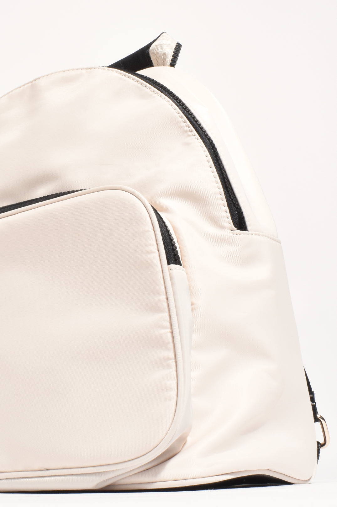 This sleek Black and Cream Backpack combines durability with sophisticated style. Constructed from easy-clean nylon material, it withstands the rigors of travel while maintaining its pristine appearance. The practical design offers optimal storage capacity and comfort for extended journeys, making it an essential companion for the discerning traveler.