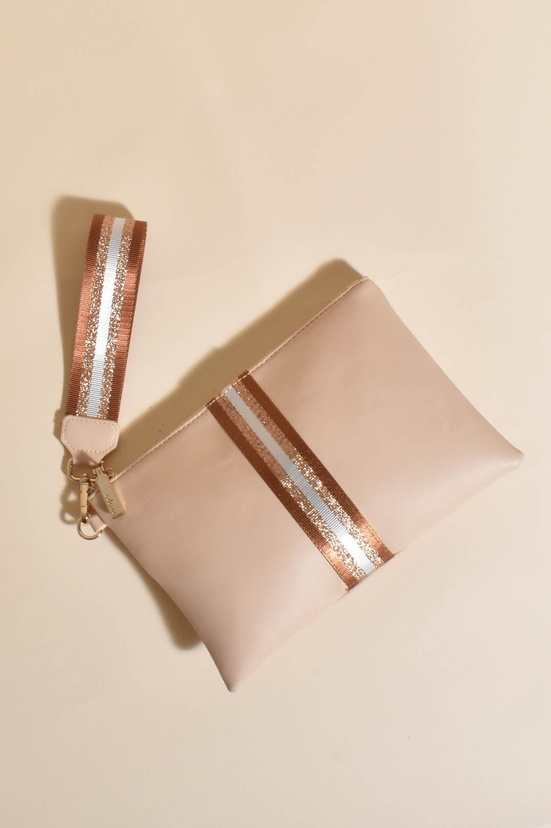 This Leila Camel and Gold stripe Pouch Handbag is a chic accessory for any outfit. The camel and gold stripes add a touch of elegance, while the gold zip fastening and matching wrist strap provide functionality and convenience. Made with quality materials, this handbag is the perfect blend of style and practicality.