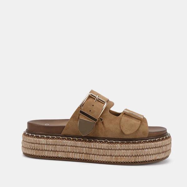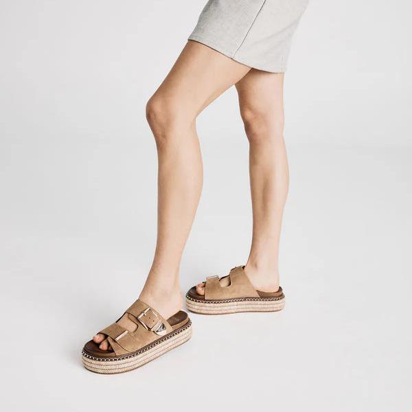 NOVO SHOES - Sazkia Flat Form Slide in Sand Suede